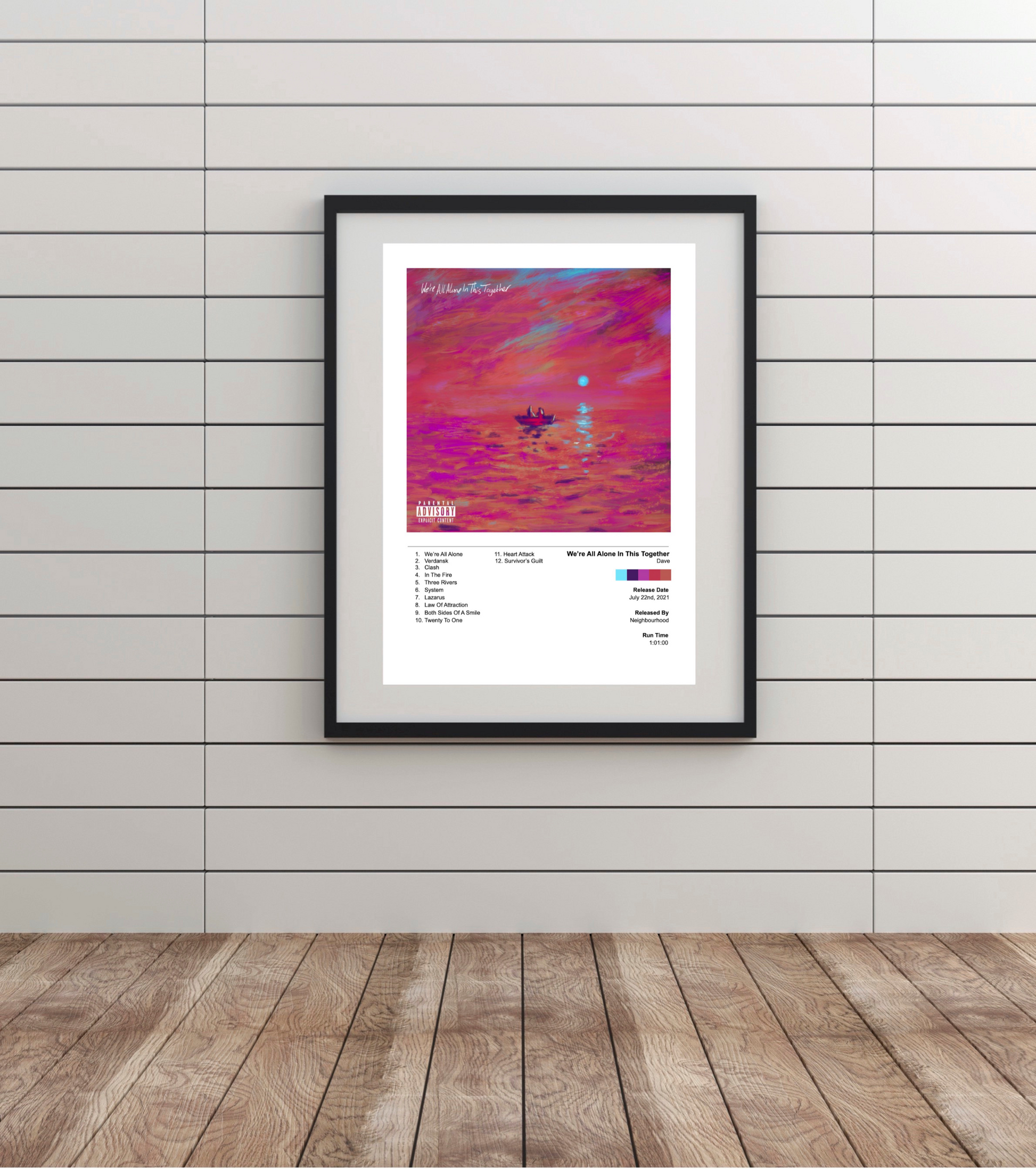We're All Alone in This Together is the second studio album by British rapper Dave, released on 23 July 2021 by Neighbourhood Recordings. The album succeeds the debut album Psychodrama, released in 2019, and includes guest appearances from Stormzy, James Blake, Wizkid, Snoh Aalegra, Boj, Fredo, Ghetts, Giggs and Meekz. We're All Alone in This Together was executive produced by Kyle Evans and Dave himself, with additional production from James Blake and Joe Reeves.