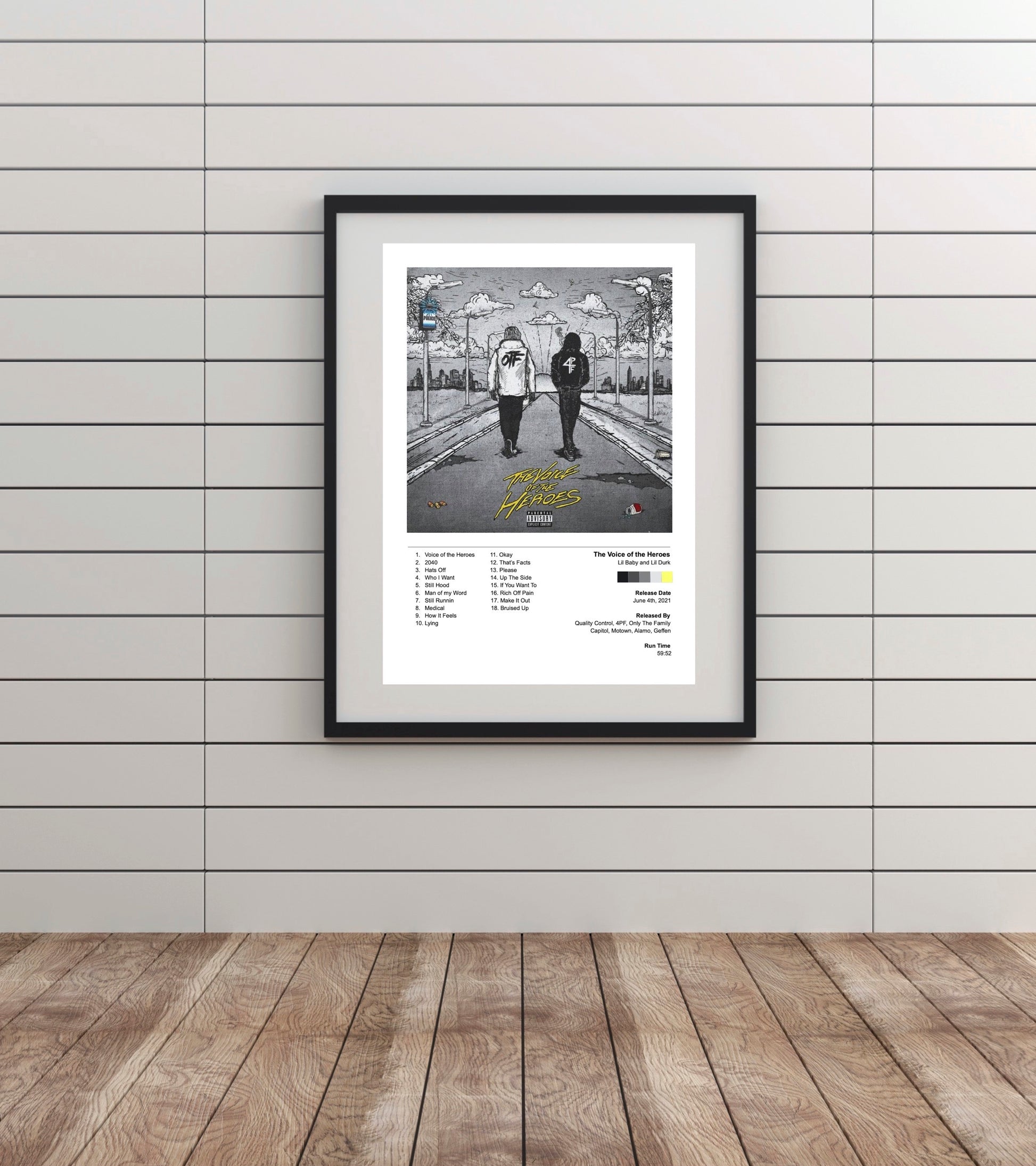 The Voice of the Heroes is a collaborative studio album by American rappers Lil Baby and Lil Durk. It was released through Quality Control Music, 4 Pockets Full, Only the Family, Alamo Records, and Geffen Records on June 4, 2021. Its title comes from Durk's childhood nickname of "the Voice" and Baby's nickname of "the Hero" that Durk had given him. The album contains guest appearances from Travis Scott, Meek Mill, Young Thug, and Rod Wave with notable production from London on da Track, Wheezy, Turbo, and Murda Beatz. It was preceded by two singles, "Voice of the Heroes", the title and opening track, which was released on May 31, 2021, and "Hats Off" with Travis Scott, which peaked at number 16 on the US Billboard Hot 100.